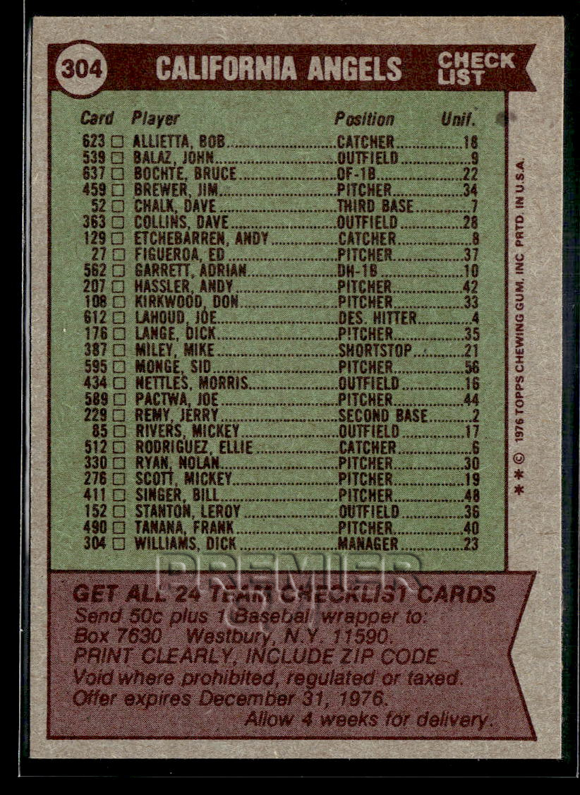 This California Angels / Dick Williams #304 . Card pictured is the actual card you will receive. All items are sold As-Is.