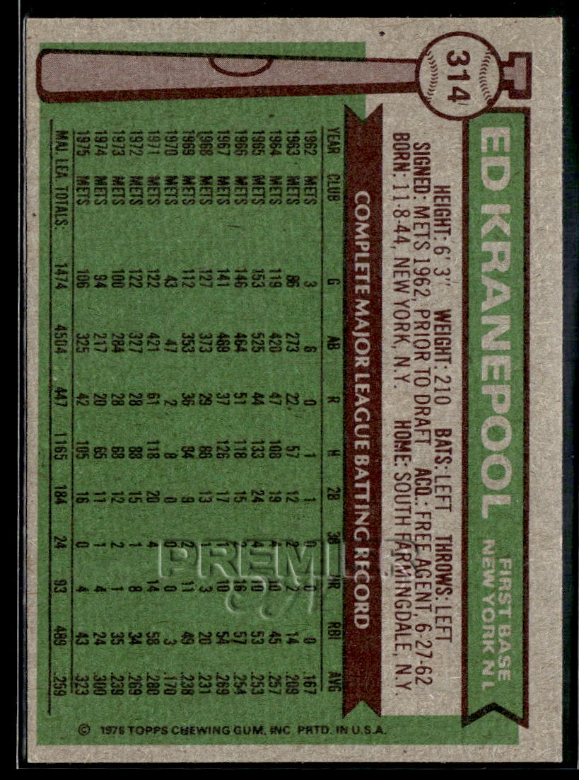 This Ed Kranepool #314 . Card pictured is the actual card you will receive. All items are sold As-Is.