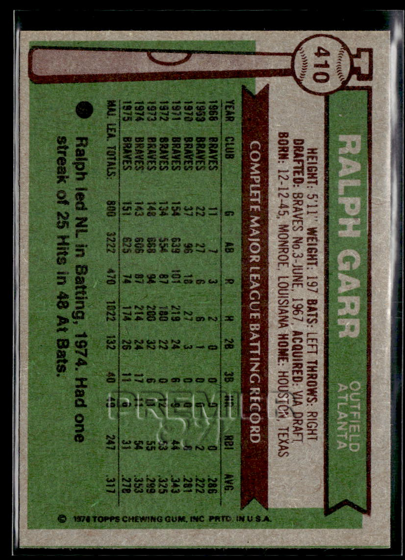 This Ralph Garr #410 . Card pictured is the actual card you will receive. All items are sold As-Is.
