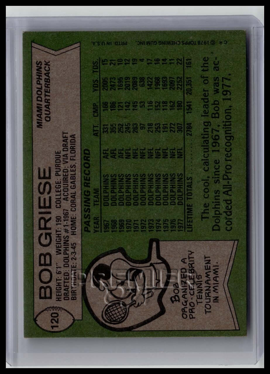 This trading card features Bob Griese #120 . It comes from the 1978 Topps sports set. The card is an original. It is a great addition to any collection. All items are sold As-Is.
