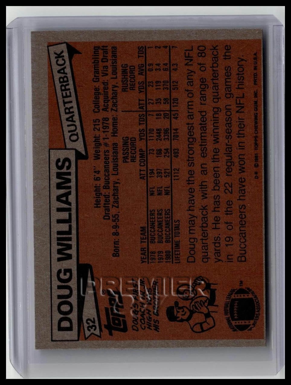 This trading card features Doug Williams #32 . It comes from the 1981 Topps sports set. The card is an original. It is a great addition to any collection. All items are sold As-Is.