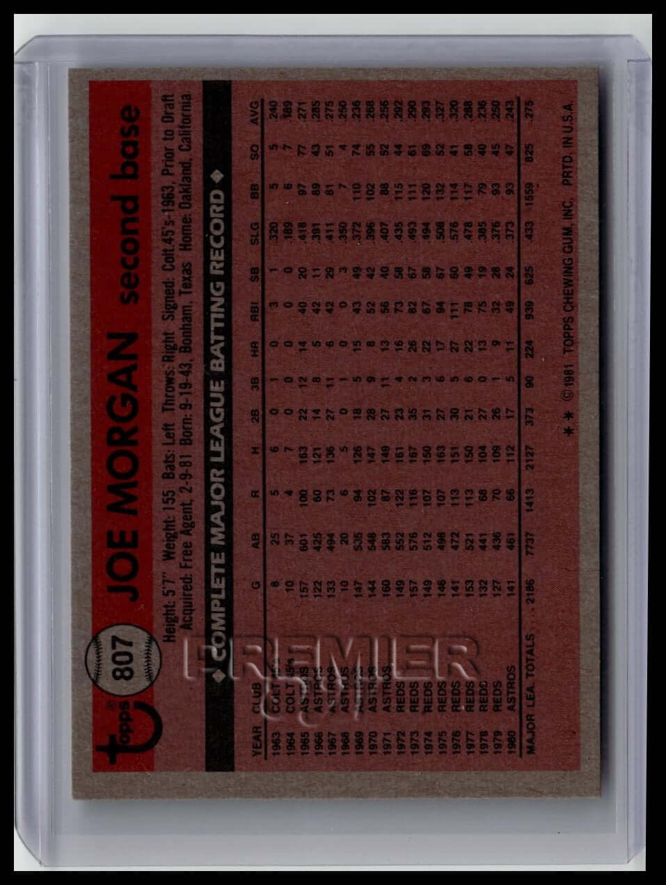 This trading card features Joe Morgan #807 . It comes from the 1981 Topps Traded sports set. The card is an original. It is a great addition to any collection. All items are sold As-Is.