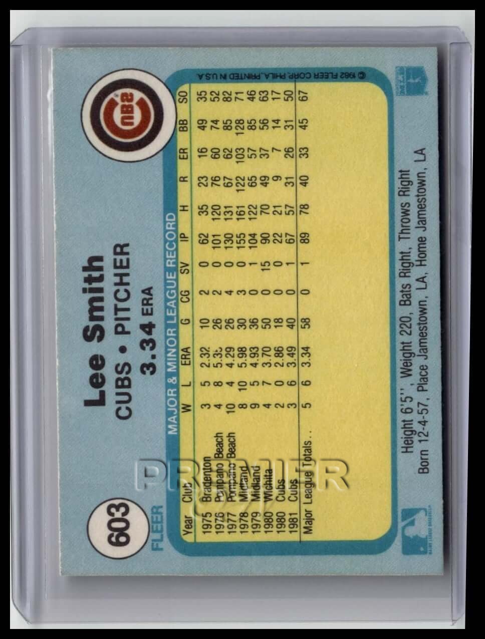 This trading card features Lee Smith #603b . It comes from the 1982 Fleer sports set. The card is an original. It is a great addition to any collection. All items are sold As-Is.