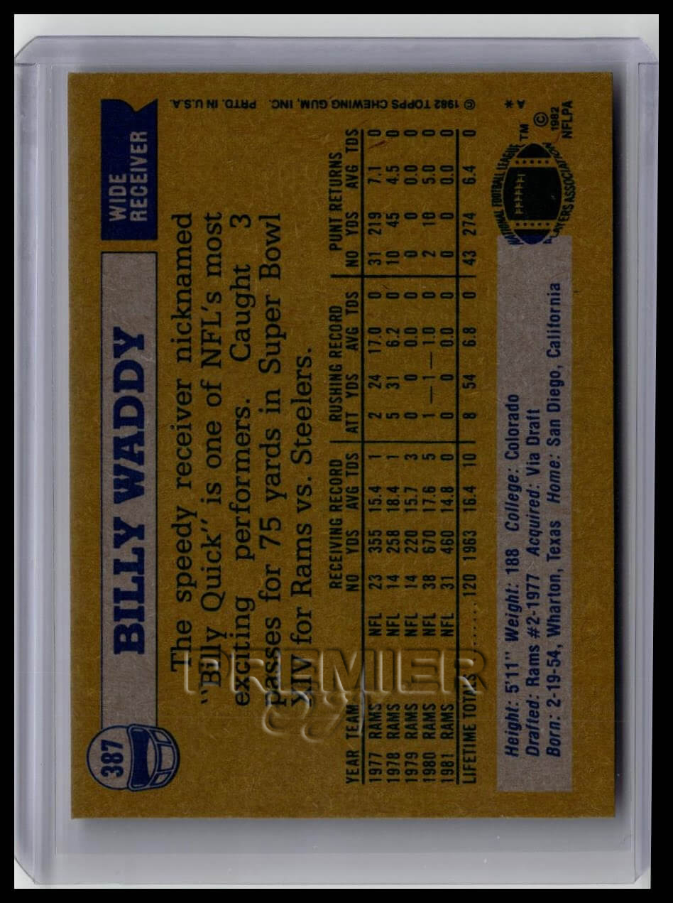 This trading card features Billy Waddy #387 . It comes from the 1982 Topps sports set. The card is an original. It is a great addition to any collection. All items are sold As-Is.