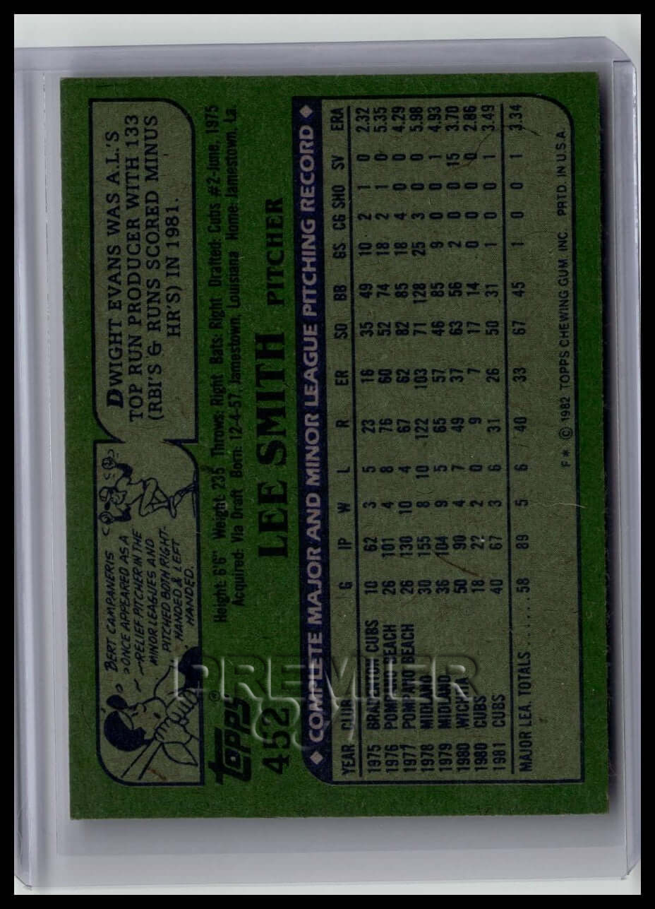 This trading card features Lee Smith #452 . It comes from the 1982 Topps sports set. The card is an original. It is a great addition to any collection. All items are sold As-Is.