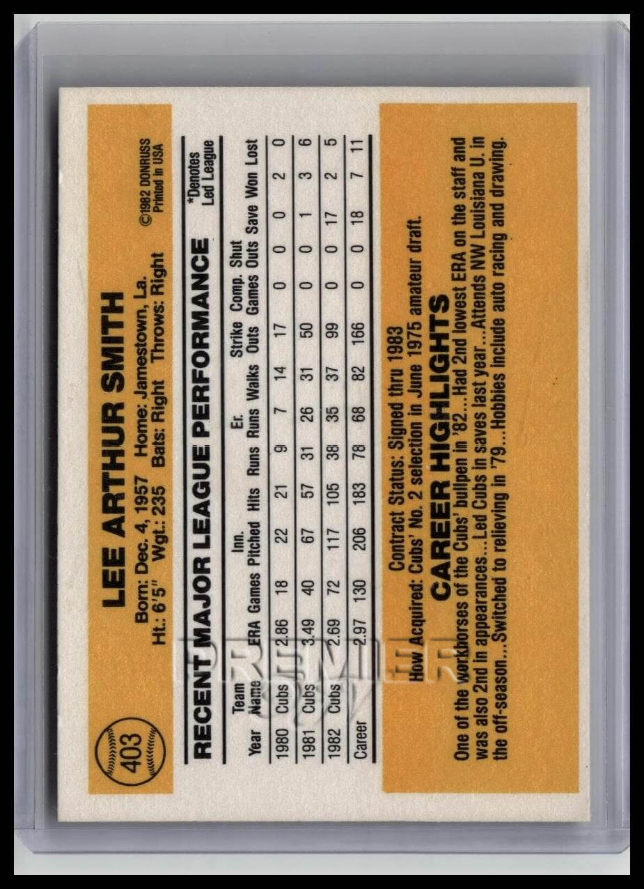 This trading card features Lee Smith #403 . It comes from the 1983 Donruss sports set. The card is an original. It is a great addition to any collection. All items are sold As-Is.