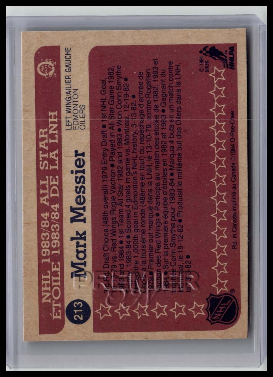 This trading card features Mark Messier #213 . It comes from the 1984-85 O-Pee-Chee sports set. The card is an original. It is a great addition to any collection. All items are sold As-Is.