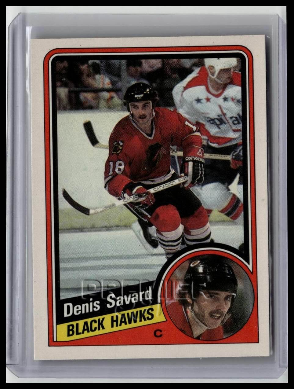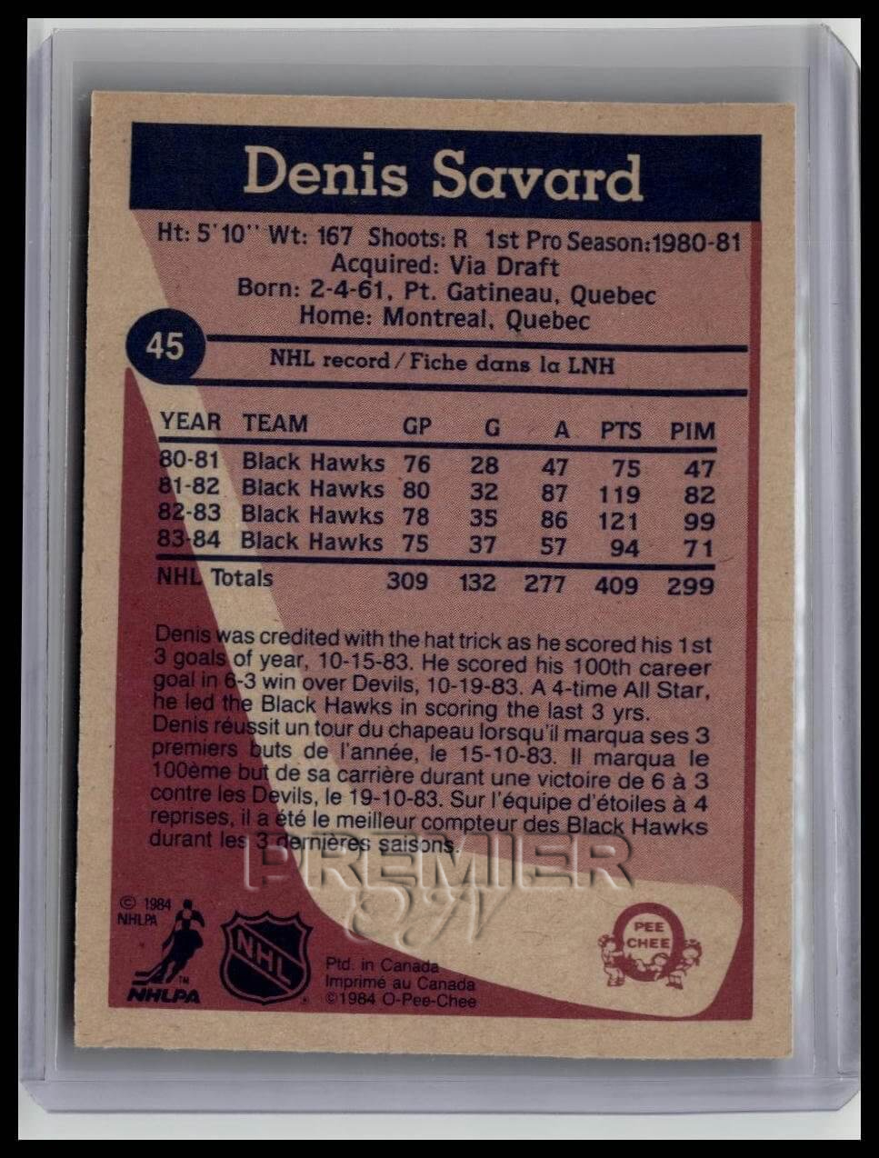 This trading card features Denis Savard #45 . It comes from the 1984-85 O-Pee-Chee sports set. The card is an original. It is a great addition to any collection. All items are sold As-Is.