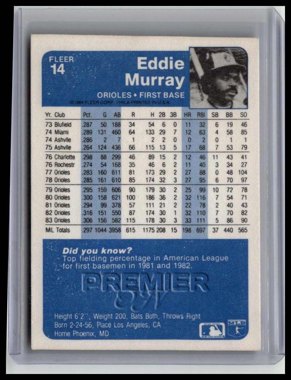 This trading card features Eddie Murray #14 . It comes from the 1984 Fleer sports set. The card is an original. It is a great addition to any collection. All items are sold As-Is.