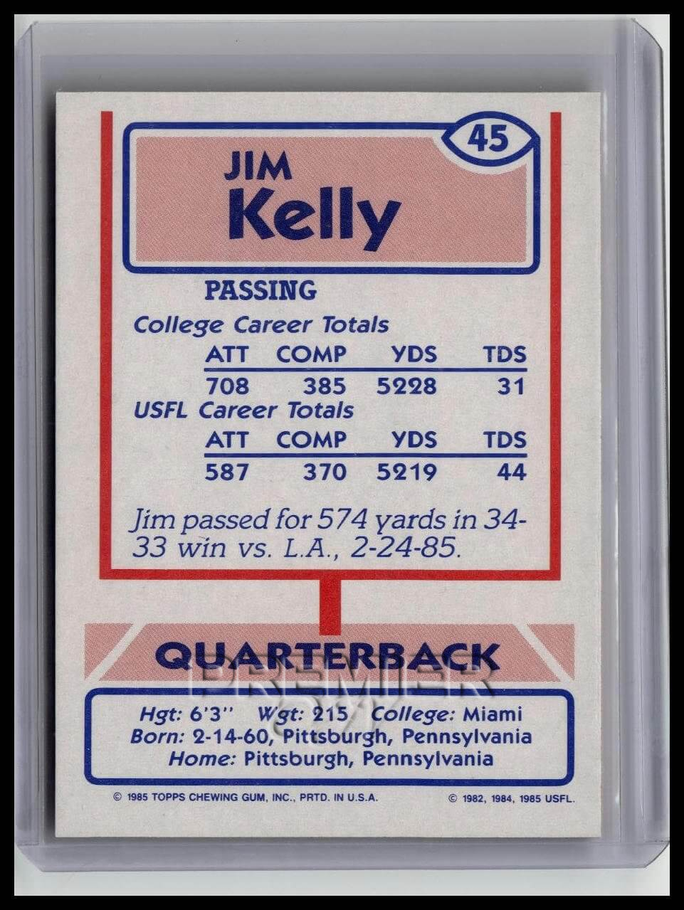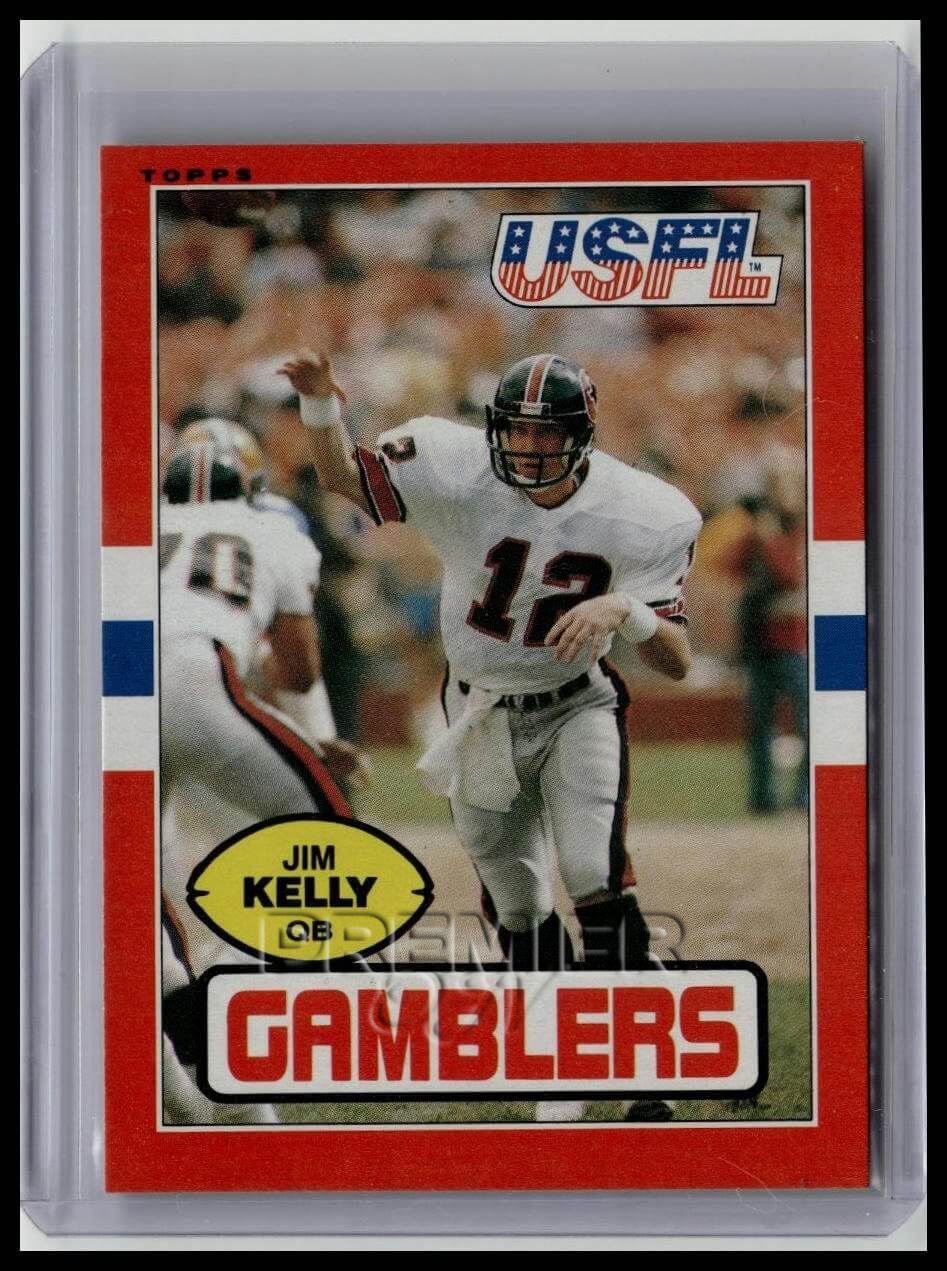 This trading card features Jim Kelly #45 . It comes from the 1985 Topps USFL sports set. The card is an original. It is a great addition to any collection. All items are sold As-Is.