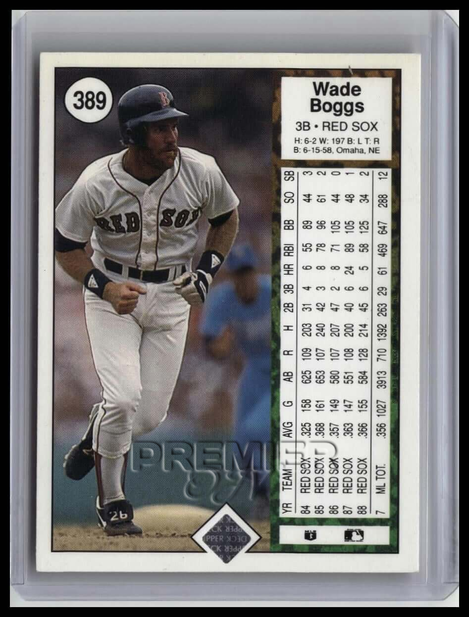 This trading card features Wade Boggs #389 . It comes from the 1989 Upper Deck sports set. The card is an original. It is a great addition to any collection. All items are sold As-Is.