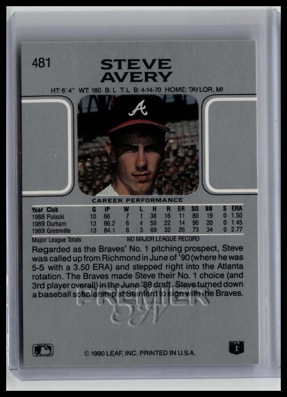 This trading card features Steve Avery #481 . It comes from the 1990 Leaf sports set. The card is an original. It is a great addition to any collection. All items are sold As-Is.