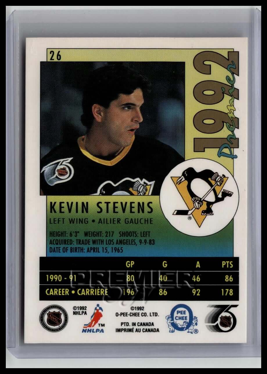 This trading card features Kevin Stevens #26 . It comes from the 1991-92 O-Pee-Chee Premier sports set. The card is an original. It is a great addition to any collection. All items are sold As-Is.