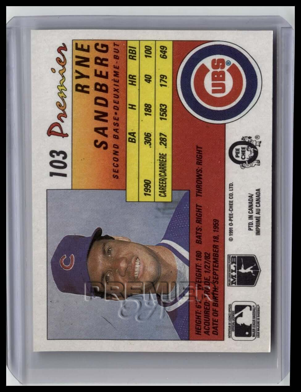 This trading card features Ryne Sandberg #103 . It comes from the 1991 O-Pee-Chee Premier sports set. The card is an original. It is a great addition to any collection. All items are sold As-Is.