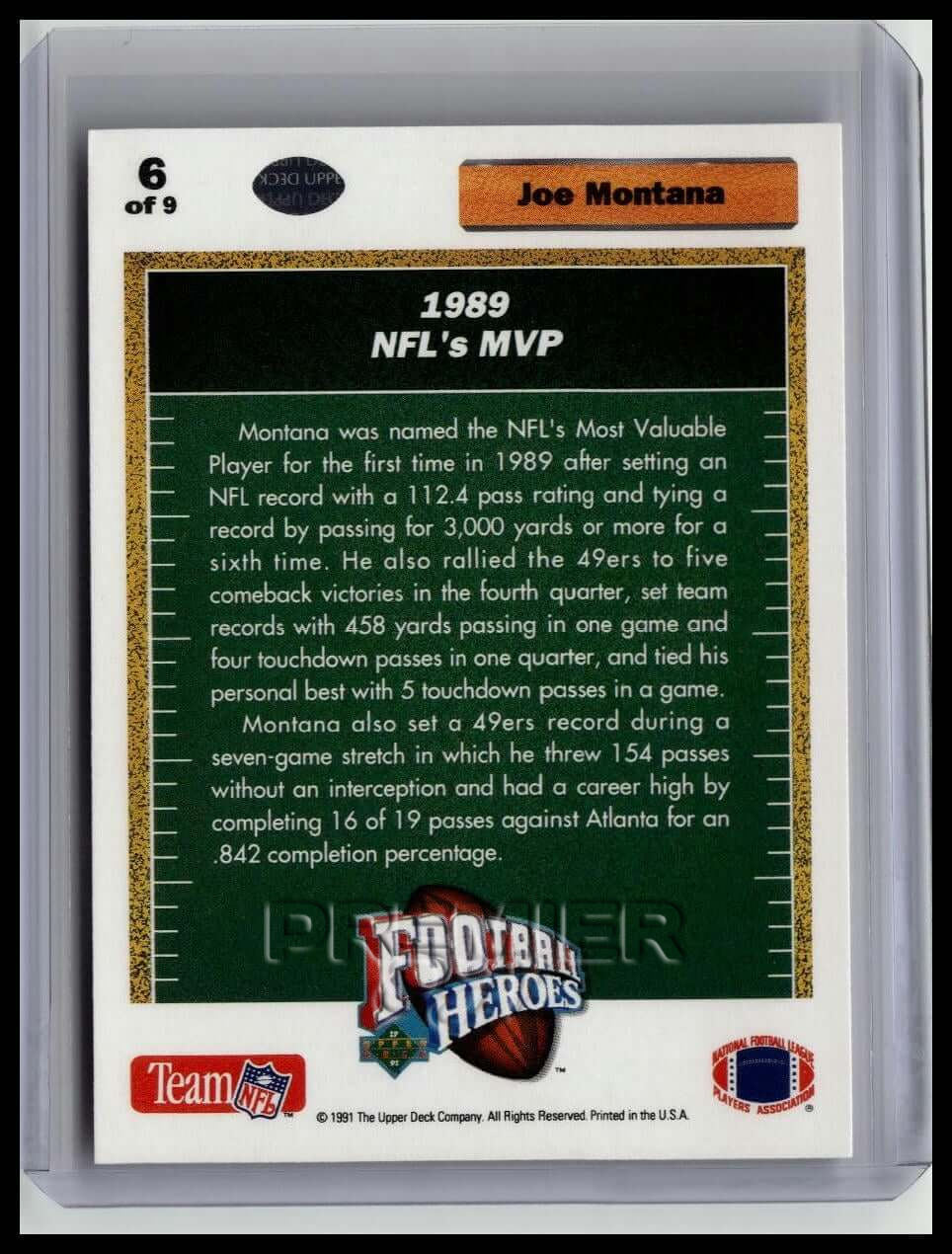 This trading card features Joe Montana #6 . It comes from the 1991 Upper Deck sports set. The card is an original. It is a great addition to any collection. All items are sold As-Is.