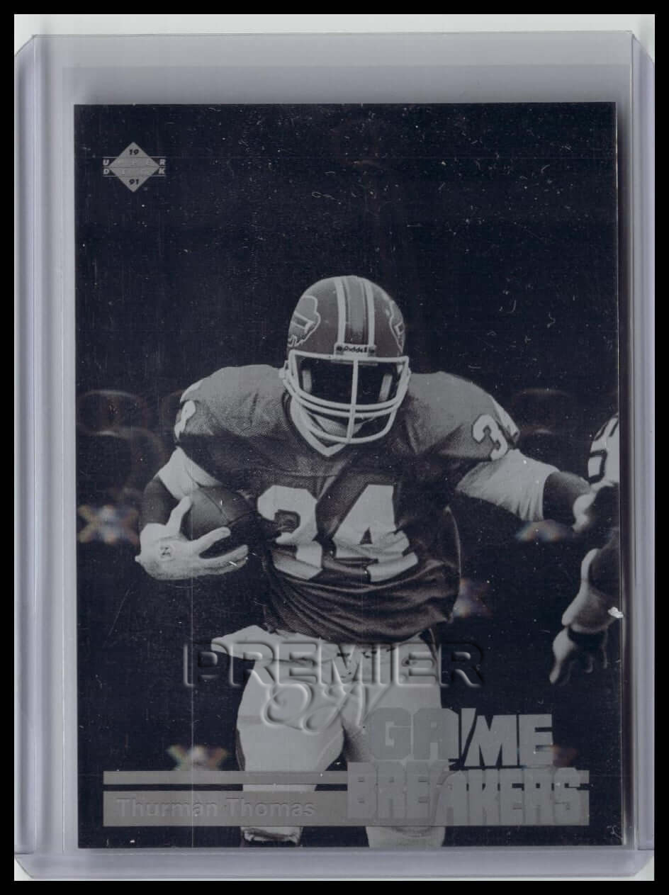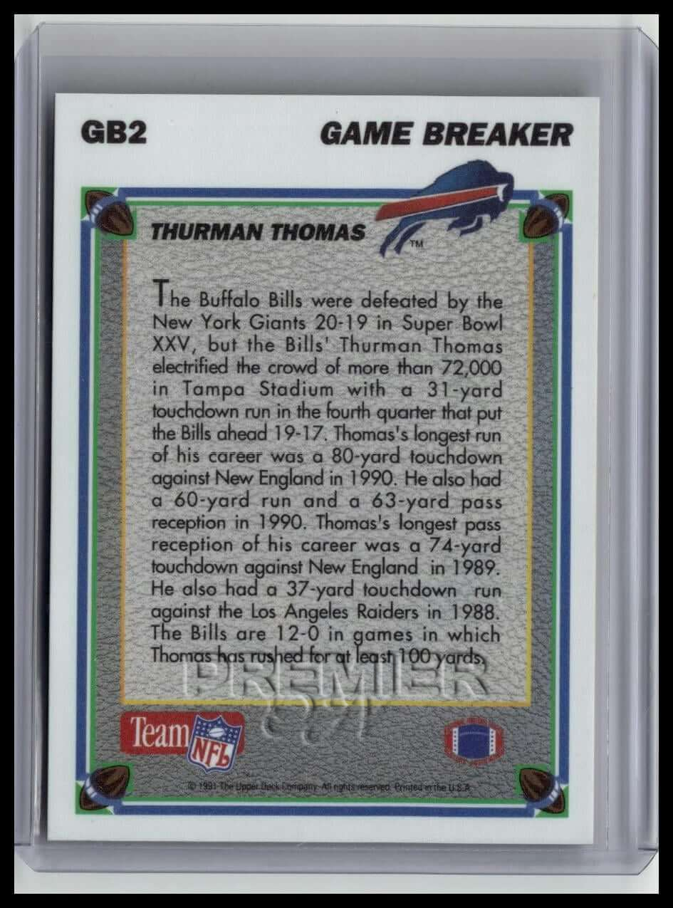 This trading card features Thurman Thomas #GB2 . It comes from the 1991 Upper Deck sports set. The card is an original. It is a great addition to any collection. All items are sold As-Is.