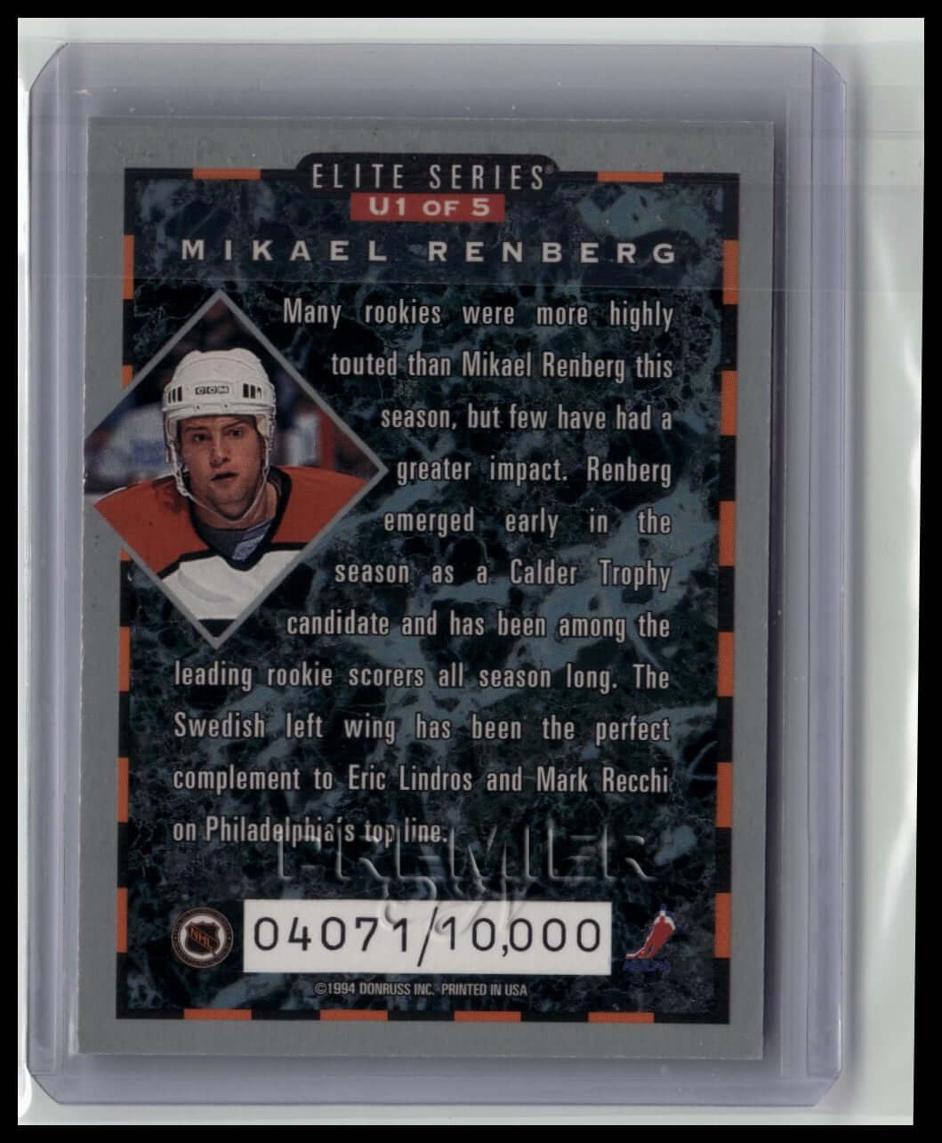 This trading card features Mikael Renberg #U1 . It comes from the 1993-94 Donruss sports set. The card is an original. It is a great addition to any collection. All items are sold As-Is.
