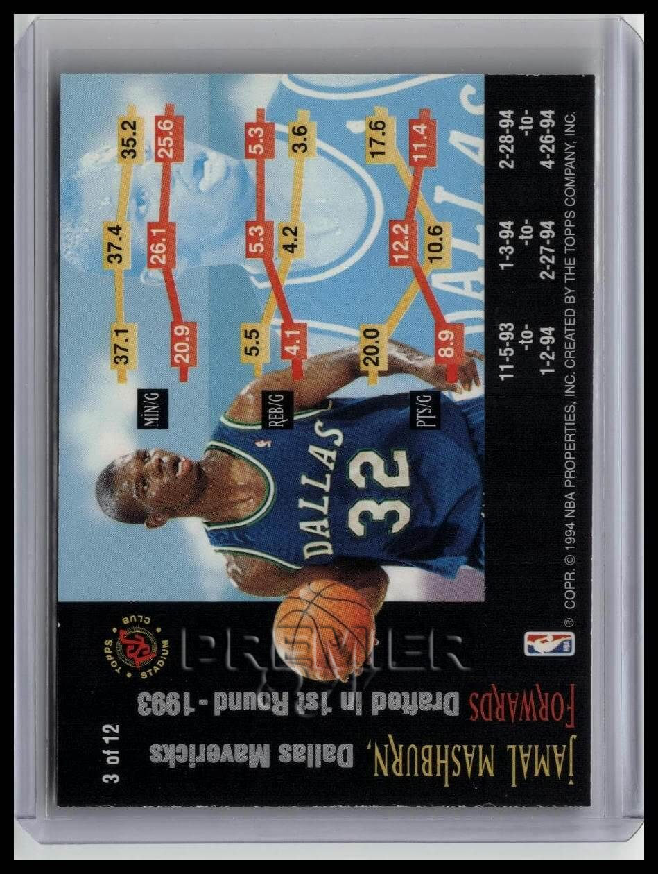 This trading card features Jamal Mashburn #3 . It comes from the 1994-95 Stadium Club sports set. The card is an original. It is a great addition to any collection. All items are sold As-Is.